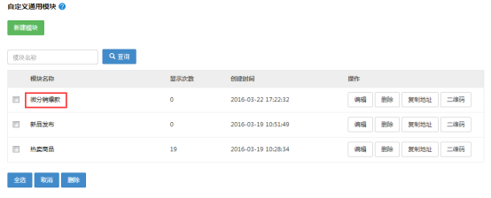 点击“自定义通用模块”进入编辑页面,点击“新建模块”按钮,进入到新建页面,设置好模块的名称,添加上自定义模块,具体添加什么模块请根据自身需求操作,这里我添加了商品列表,然后保存。返回到自定义通用模块列表页面。如下图所示: