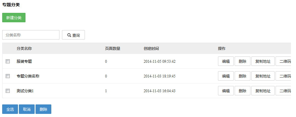 新建分类、编辑分类、删除分类、复制分类地址、查看分类二微码功能。在分类列表页,可以根据分类名称查询,还可以批量设置删除。