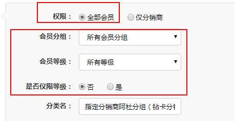 注意:专题分类设置会员分组和会员等级条件后,需要同时满足方可访问该分类的专题。如果一个专题A同时设置了2个专题分类B和C,那么如果会员访问A专题,必须同时满足B和C的条件。 ② 仅分销商:同上
