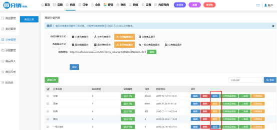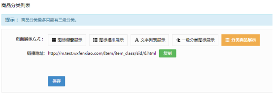 商品分类最多只能添加三级。显示方式分为五种:图标橱窗展示、图标横排展示、文字列表展示、一级分类图标展示和分类商品展示。