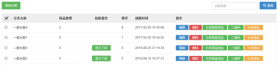 可以添加商品分类,可以对商品进行编辑、删除,还可以根据分类名称查询商品。