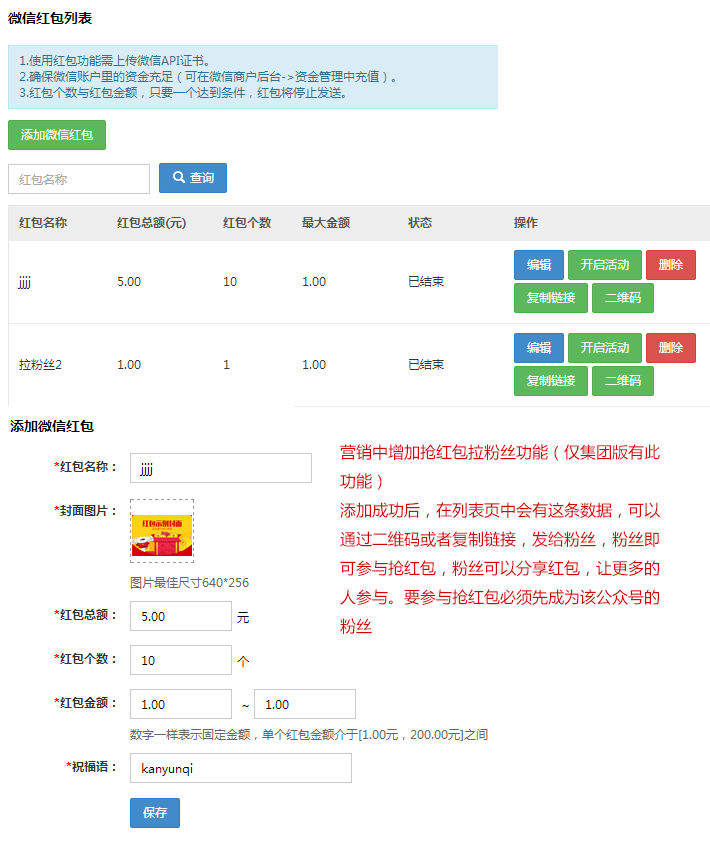使用此功能,需要使用红包功能需上传微信API证书,上传证书请前往设置->店铺信息->支付设置上传apiclient_key,apiclient_cert;确保微信账户里的资金充足(可在微信商户后台->资金管理中充值);红包个数与红包金额,只要一个达到条件,红包将停止发送。