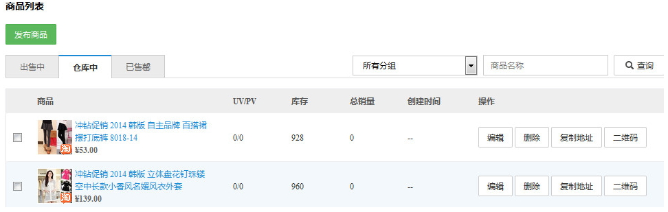 仓库中的商品:商品列表页,可以发布商品、根据分组或商品名称进行查询、对商品进行批量上架和删除、对商品进行编辑、删除、复制商品地址、查看商品二维码