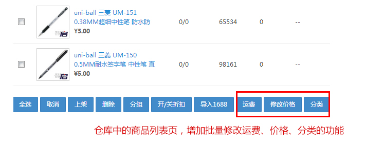 仓库中的商品列表页,增加批量修改运费、价格、分类的功能