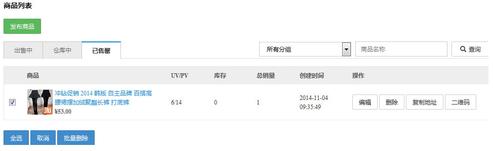 已售馨的商品:商品列表页,可以发布商品、根据分组或商品名称进行查询、对商品进行批量删除、对商品进行编辑、删除、复制商品地址、查看商品二维码。