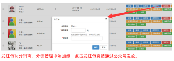 分销商管理是显示所有分销商的列表,用户可以根据查询条件查询指定的分销商;分销商列表中有针对每个分销商的操作设置,如调整佣金、发放优惠券、财务报表、查看订单、查看下级等操作;