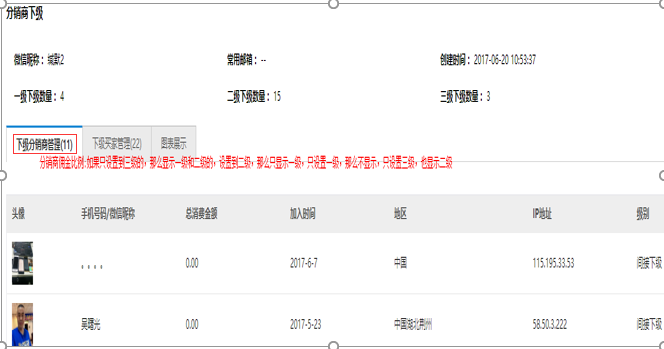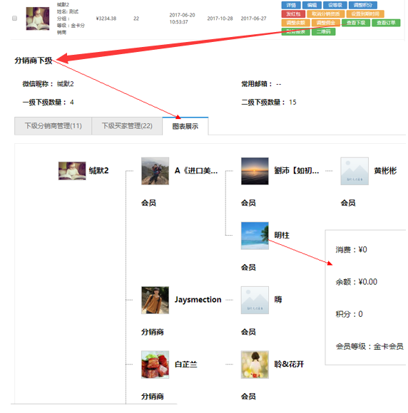 查看下级:查看分销商下级时会员列表会显示会员等级,分销商等级,选择图表展示,可更加直观的查看下级的关系
