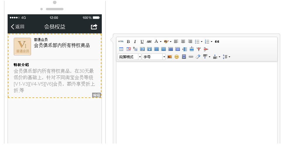会员权益是管理员对会员等级所享受的福利补充,可在编辑器里对各个等级进行文字、图片的描述。此部分内容显示在“会员中心——会员等级与特权”页面。