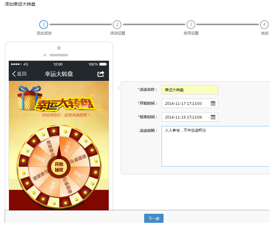 新建幸运大转盘,需要填入活动名称、开始时间、结束时间、活动说明,点击下一步