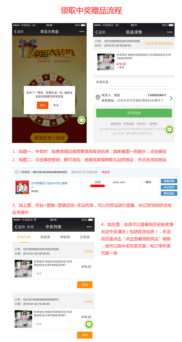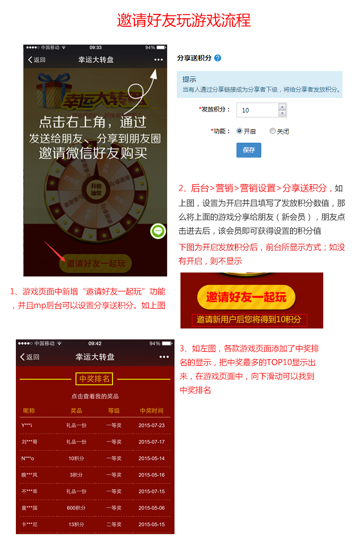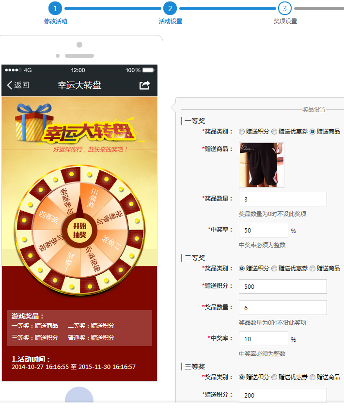 需要设置奖品信息:填入赠送积分、奖品数量、中奖率(奖品中奖率之和要小于100)、未中奖说明,点击提交,活动就添加完成了。