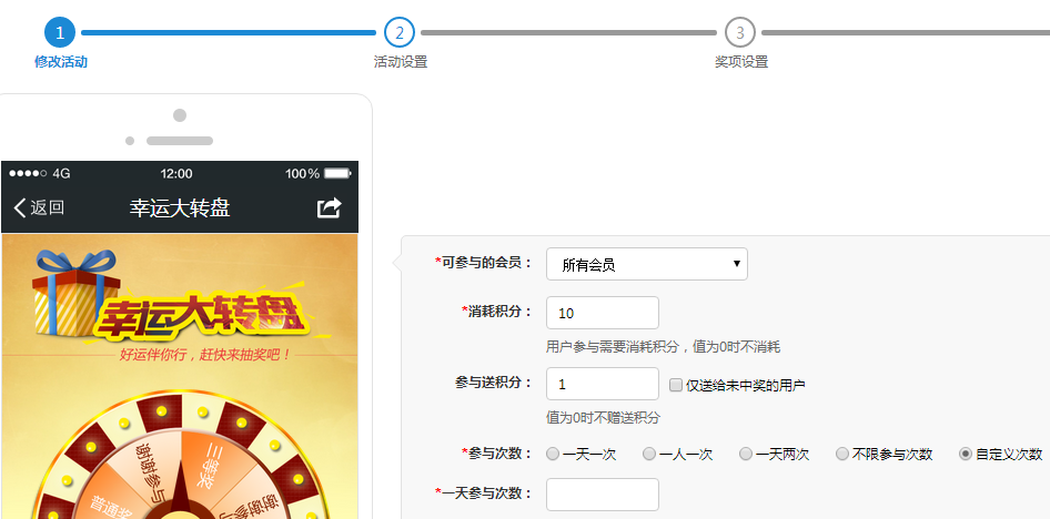 选择可参与的会员等级,玩游戏需要消耗的积分,参与送积分(填入”0“不送积分,填入赠送积分,可选择送给未中奖还是全部参与会员),选择参与次数,点击下一步