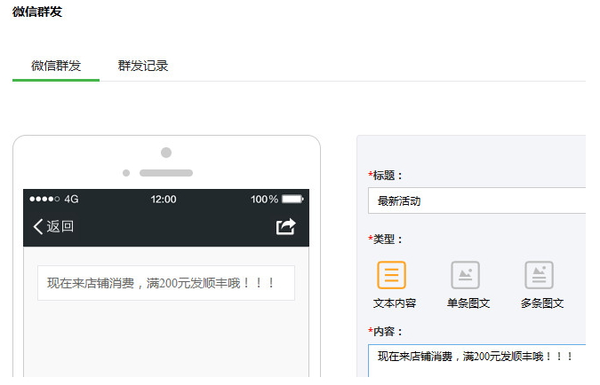 选择类型多条图文,可以选择多条图片和添加多条图文,点击保存,微信群发就完成了