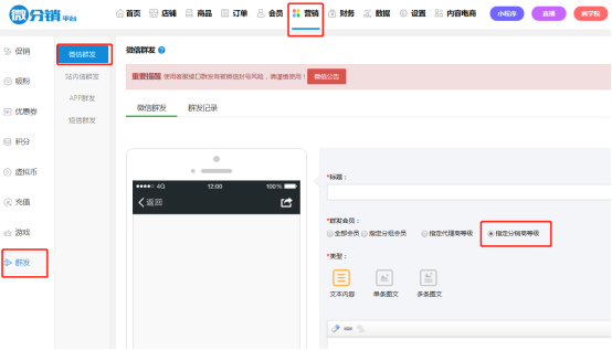 操作步骤: 总部后台→营销→群发→微信群发:群发会员增加“指定分销商等级”的条件。
