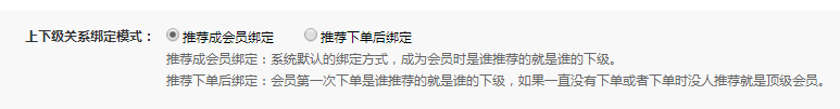 推荐成会员绑定:系统默认的绑定方式,成为会员时是谁推荐的就是谁的下级。推荐下单后绑定:会员第一次下单是谁推荐的就是谁的下级,如果一直没有下单或者下单时没人推荐就是顶级会员。