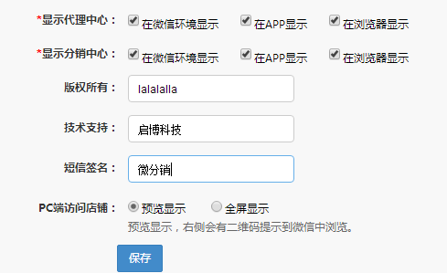 17、下面的设置主要是设置会员中心的显示内容,比如显示分销中心这个功能,勾选了,如果会员是分销商,在会员中心就会显示分销中心项,是门店会显示门店管理,是员工会显示员工管理,否则,不会显示。
