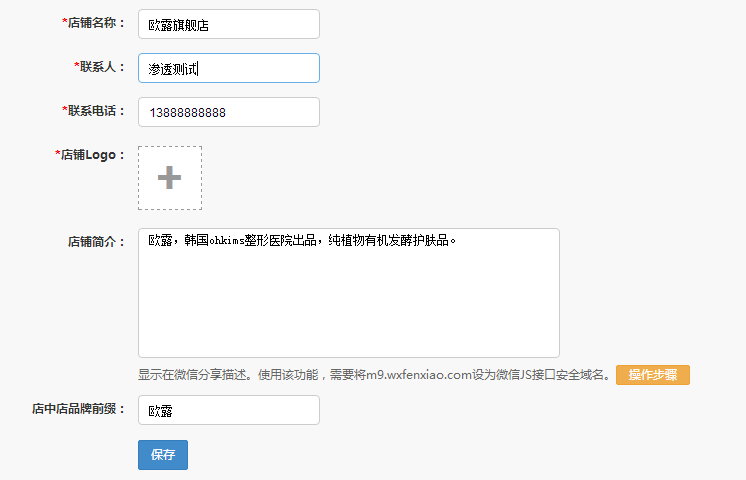 3、门店扫码支付使用该功能需要设置门店的地址,并进入公众号后台,在“微信支付”的“开发配置”里设置扫码支付的回调URL:http://m9.wxfenxiao.com/WxPay/codePay?sid=202493 (此URL每个店铺不一样,可以复制自己的URL)