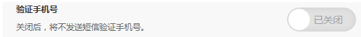 1、验证手机号。选择关闭后,将不在发送短信验证手机号的真实性。