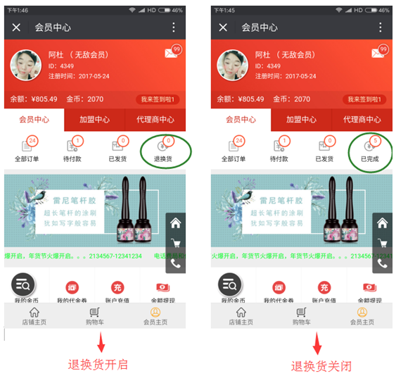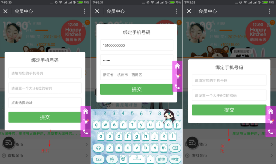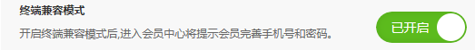 2、终端兼容模式。开启终端兼容模式后,进入会员中心将提示会员完善手机号和密码。