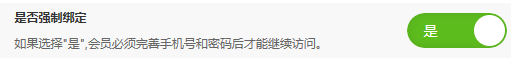 3、是否强制绑定。如果选择"是",会员必须完善手机号和密码后才能继续访问。
