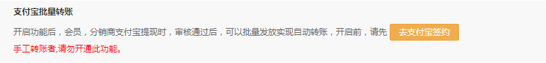 1、支付宝批量转账。选择开启前,请先去支付宝签约。手工转账者,请勿开通此功能。具体参考系统提示操作。