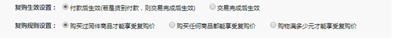 11、复购设置。复购可以设置为需要购买过同件商品才能享受复购价,还是购买任何商品都能享受复购价。客户可以根据自己的需求,在商品设置中选择复购生效设置(付款后生效或交易完成后生效)和复购规则设置(购买过同件商品才能享受复购价或购买任何商品都能享受复购价),客户端会员就会享受对应规则设置的复购价。备注:如果商品即参与了某项营销活动,又设置了复购价格,那么优先享受活动。备注:SKU复购价跟商品复购价是一样哦复购规则 “购物满多少元才能享受复购价”,避免会员购买很低价格的商品也可以享受全店其他商品复购价的情况。