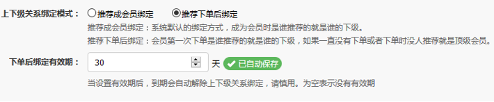 16、上下级关系绑定模式有两种:1、推荐成会员绑定 2、 推荐下单后绑定