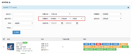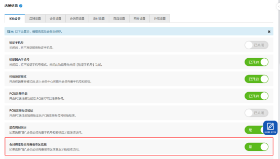 操作步骤: 总部后台→设置→系统设置:增加“会员绑定是否完善省市区信息”,默认是关闭的,开启后,绑定会员信息时要选择省市区。开启后,后台会员检索功能增加到区域