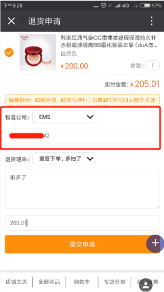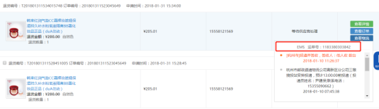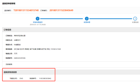退换货审核列表,可以点击“查看物流”,最上面就会显示物流公司和快递单号