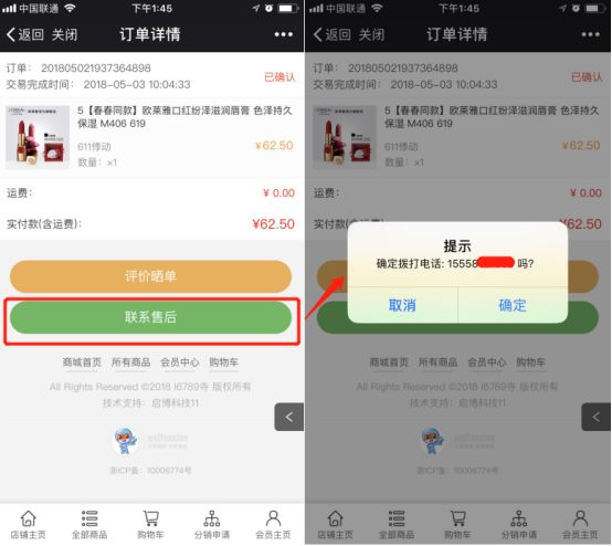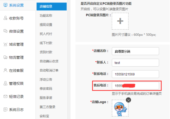 操作步骤: 总部后台→设置→系统设置→店铺信息→店铺设置:编辑“售后电话”后,手机端交易完成的订单,订单详情页增加“申请售后”的按钮,点击后可拨打售后联系电话进行线下处理。