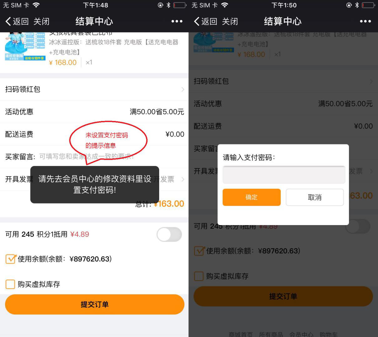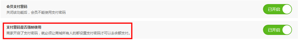 新增配置项“支付密码是否强制使用”,开启后,使用余额支付时必须填写支付密码才能付款。未设置支付密码的,使用余额支付时会有相应提示信息。