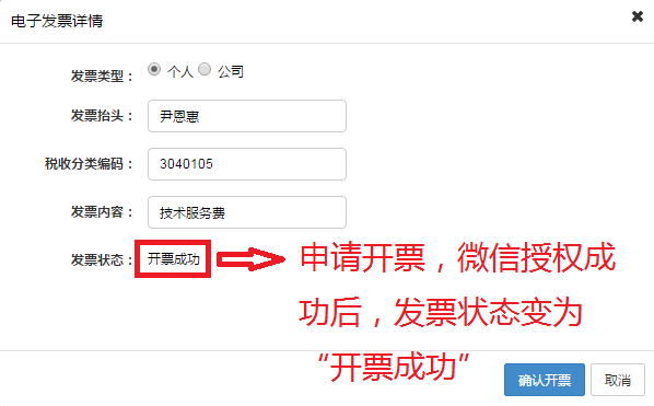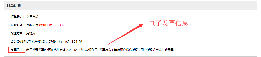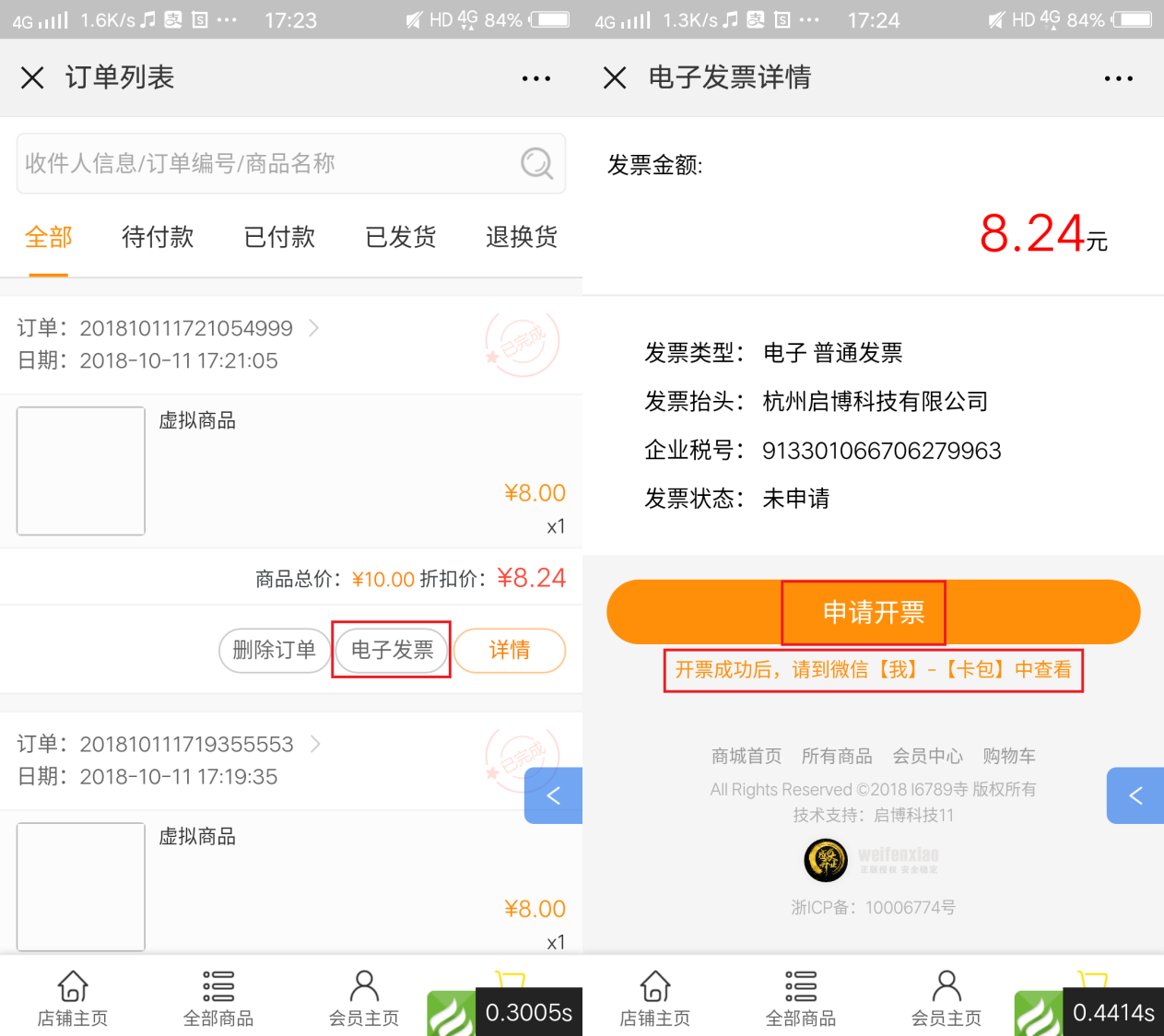 会员在手机端申请开票后,微信授权成功后,后台可以确认开票,之后电子发票会同步微信【我】--【卡包】: