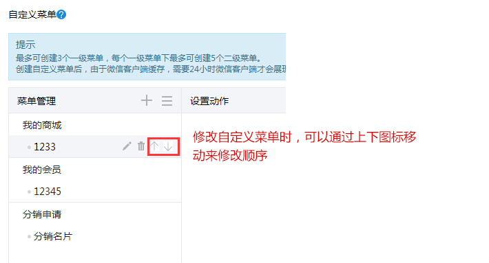 修改自定义菜单时,可以通过上下图标移动来修改顺序