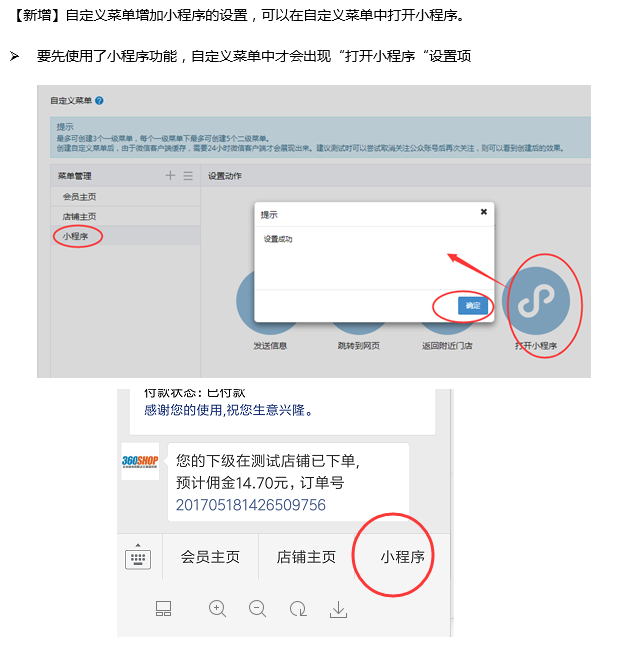 操作步骤: 总部后台—>设置—>自定义菜单:首先要去小程序微信公众后台-添加管理小程序-关联小程序,然后在微分销后台设置-自定义菜单中设置小程序的appid和小程序的页面路径,从微信公众号里面就可以直接打开相关联的小程序。 注意:只有关联过公众号的小程序才可以绑定到微分销的自定义菜单。