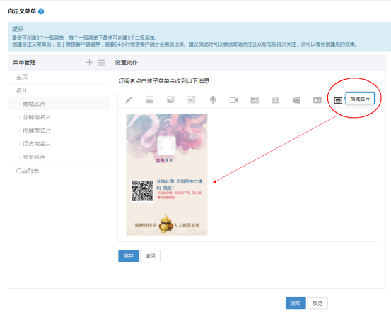 操作步骤: 总部后台→设置→微信设置→自定义菜单:设置动作页面增加“商城名片”后台默认获取的是会员名片,微信端获取时会根据会员身份来分别获取对应的名片,比如我是订货商,我微信端获取商城名片时就会获取到订货商名片。
