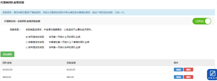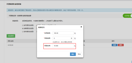 【增加】代理商团队业绩奖励增加奖励比例   代理商业绩奖励规则添加/编辑规则时,增加奖励比例,奖励金额和比例都设置的话优先金额。