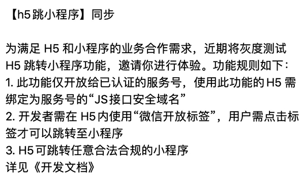 据介绍,该功能的意思是,原本企业常用的H5消息可绑定小程序,而后,当用户点击H5消息即可直接跳转到对应的小程序中。“也就是说,点击App内的H5链接可以直接跳转到小程序,微信里的H5链接也可以跳转到小程序(以前只能跳转到浏览器相关页面)。”其中一位开发者补充道。