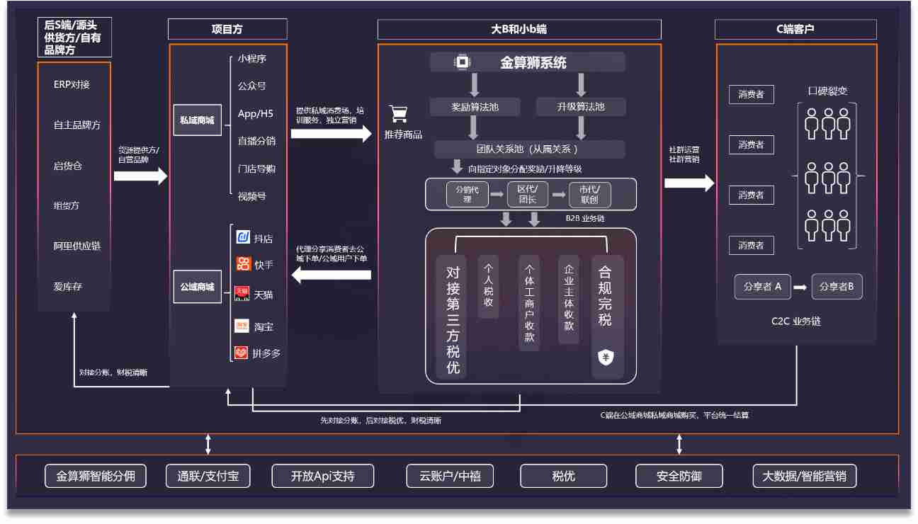 金算狮全域渠道营销解决方案包含:全域渠道营销解决方案业务、代理分销SDK业务、社群电商解决方案业务