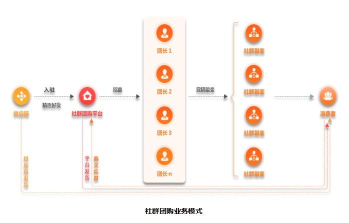 社群电商作为社交新零售创新模式之一,商家与用户之间实现直接零距离沟通,通过好友关系以及二度、三度甚至完全陌生的关系和人脉不断建立新的链接纽带,借助社交强关系达到销售目的,品牌方通过团长进行裂变分销。