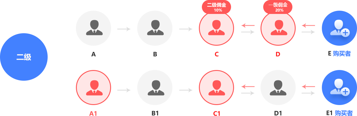 1、商品的价格200元 E购买 D40元 C20元 B不拿,因为主要下单人是谁,往上推二级。