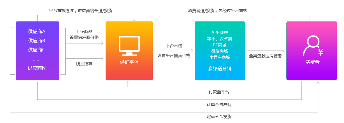 提供多供应商供货、销货、零售和返佣等一体化功能