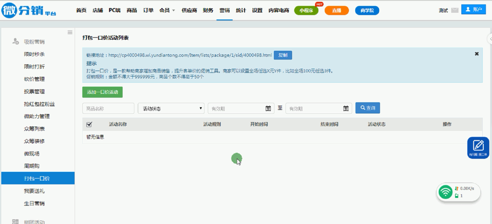 打包一口营销功能是一款帮助商家商品销售,提高客单价的促销工具。商家可以设置全场任选多少元或是多少件一口价,比如100元3件。